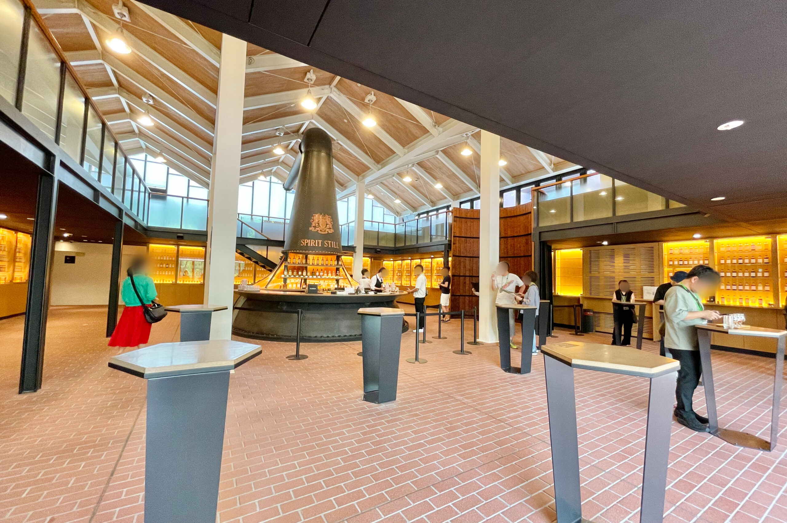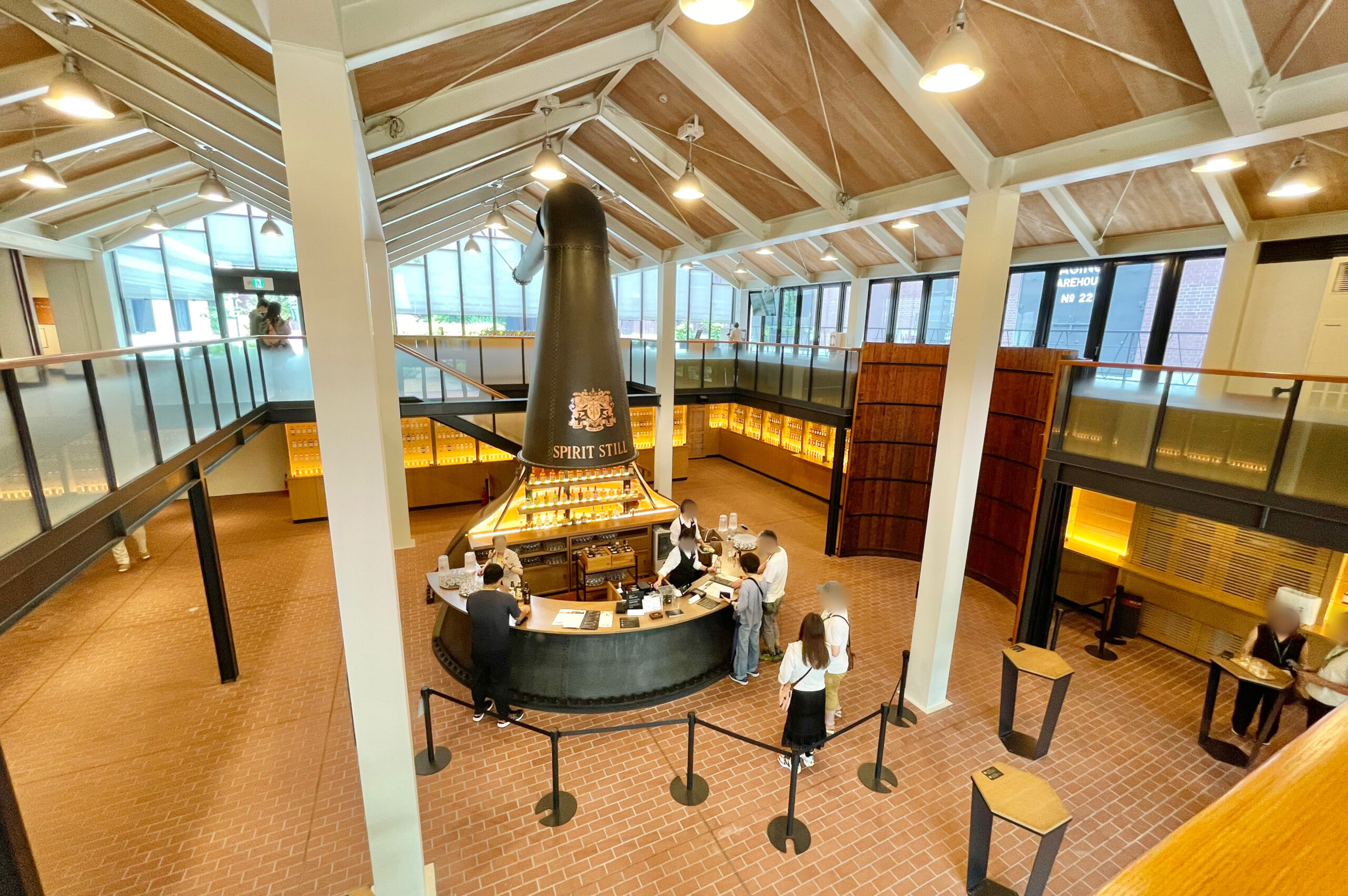 吹き抜けになったテイスティングラウンジは、中央の大きなポットスチルが目印。ここでは、山崎をはじめ、貴重な原酒やウイスキーのテイスティングが有料で楽しむことができます。