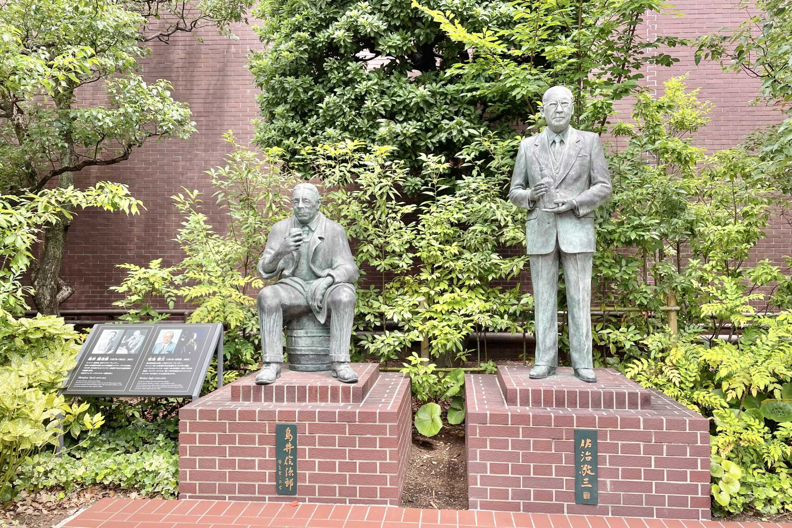 ウイスキー館を出てすぐのところにあるのは、サントリー創業者であり、初代マスターブレンダーの鳥井信治郎氏の像(左)。その隣には、鳥井信治郎氏の息子で、二代目マスターブレンダーの佐治敬三氏の像(右)も展示されています。日本のウイスキーの歴史に欠かせないお二人です。