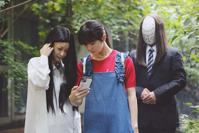 場面写真では、主人公・美咲(中島瑠菜)の背後にお面を被ったスーツ姿の“神様“が立っている奇妙なショットや、美咲と皐月(まいきち)が学校の階段でスマホを見ながら笑い合う後ろに神様が立っている姿など、日常の中に“神様”が姿を現した摩訶不思議な世界が切り取られている。