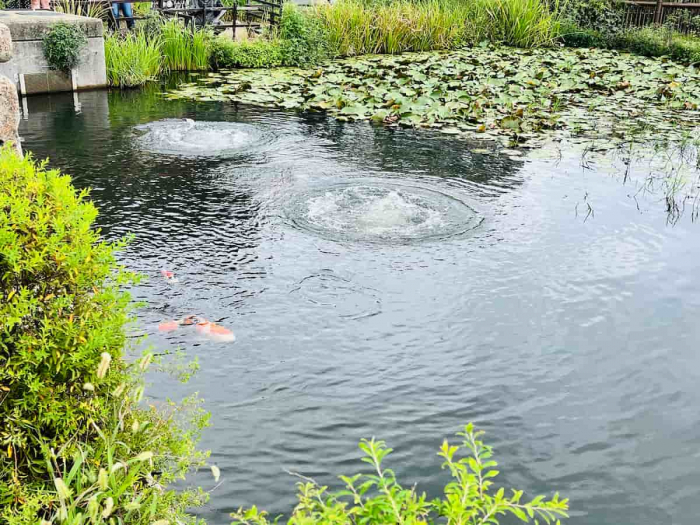 池のほとりに腰を下ろして数分。静かな水面を眺めていると……突然、水面にブクブクと泡が浮かび始めます。