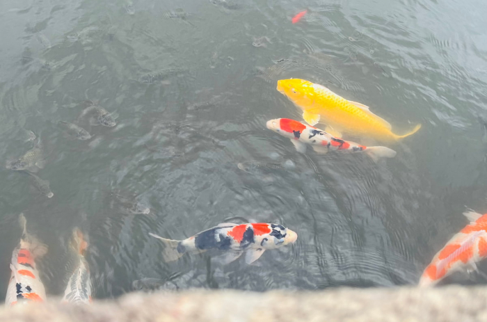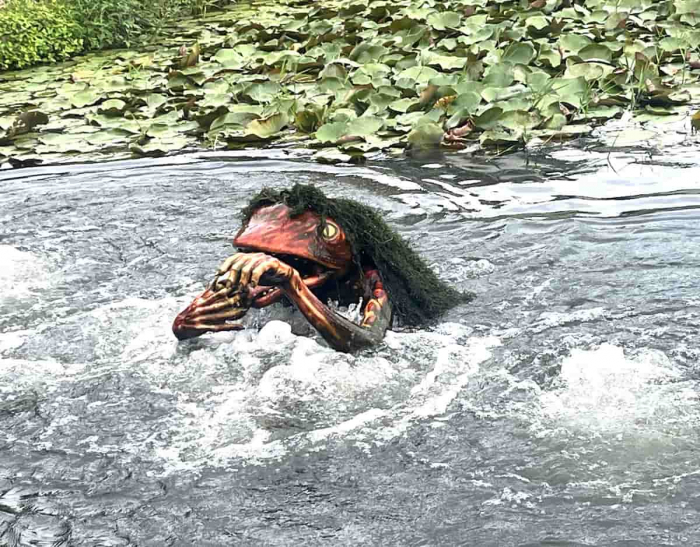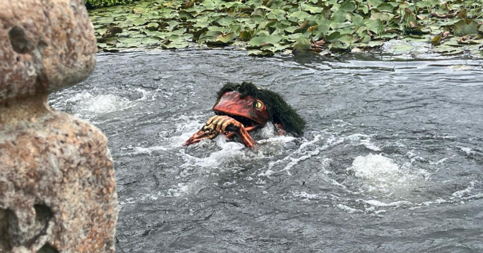 そして、この公園にはカッパが飛び出してくる池もあるんです。一見、蓮の葉が浮かぶ普通の池。鮮やかな鯉も泳いでおり、穏やかな風景ですが――。