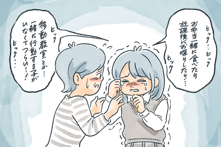 娘は、「イジメられているわけではない。体育の授業とかグループ活動には普通に参加できている。ただ、お弁当を一緒に食べたり、放課後にお喋りしたり、移動教室などで一緒に行動する子がいなくてつらい」と、自分の気持ちを打ち明けてくれていました。「クラスで孤立している話」をし始めると泣き出してしまう娘。見守ることしかできず歯がゆい思いでした。