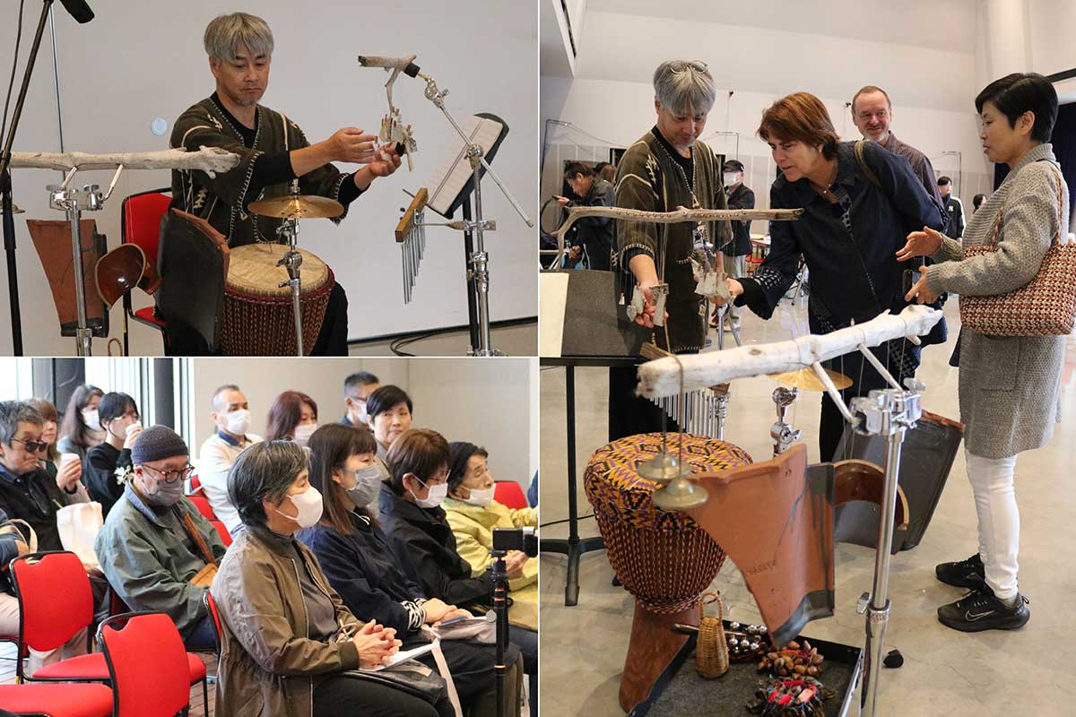会場では岩手の世界遺産に関係したものづくりのワークショップを開催。御所野は組紐、橋野は鋳造、平泉は絵付け体験などを実施。県内高校生による民俗芸能公演もあった。音楽ライブには奥州市出身の鶴田流薩摩琵琶演奏家千山ユキさん、大槌町出身の大久保正人さんを中心に結成する音楽集団「和美東(わびとう)」が出演した。千山さんは源氏物語をテーマにした「春の宴」、奥州藤原氏初代清衡の平和への願いを込めたオリジナル曲「修羅と浄土」を披露。和美東は、自然や神への思いを込めた「光る海」「涙の糸」など4曲を演奏。両者のコラボで「祇園精舎」、宮沢賢治作品「ポラーノ広場」の中の歌曲も披露した。