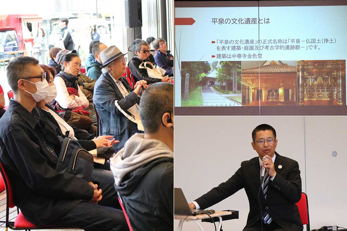 12日のイベントではオープンスクールとして、平泉と橋野鉄鉱山の概要などを学べる講話があった。平泉町世界遺産推進室長補佐の島原弘征さんは、奥州藤原氏が目指した仏国土(仏の教えによる平和な理想社会)について「(世界遺産になった)中尊寺金色堂や毛越寺の浄土庭園は平和の理念を当時の人々に分かりやすく伝えるためのもの。最先端の技術を使い、文化レベルの高さを示すことで、朝廷(京都)と対等な関係を築こうとした」と解説。池の形や道路の位置など当時の地形、風景が状態よく残っていたことも評価のポイントに挙げた。