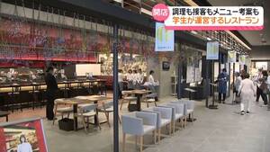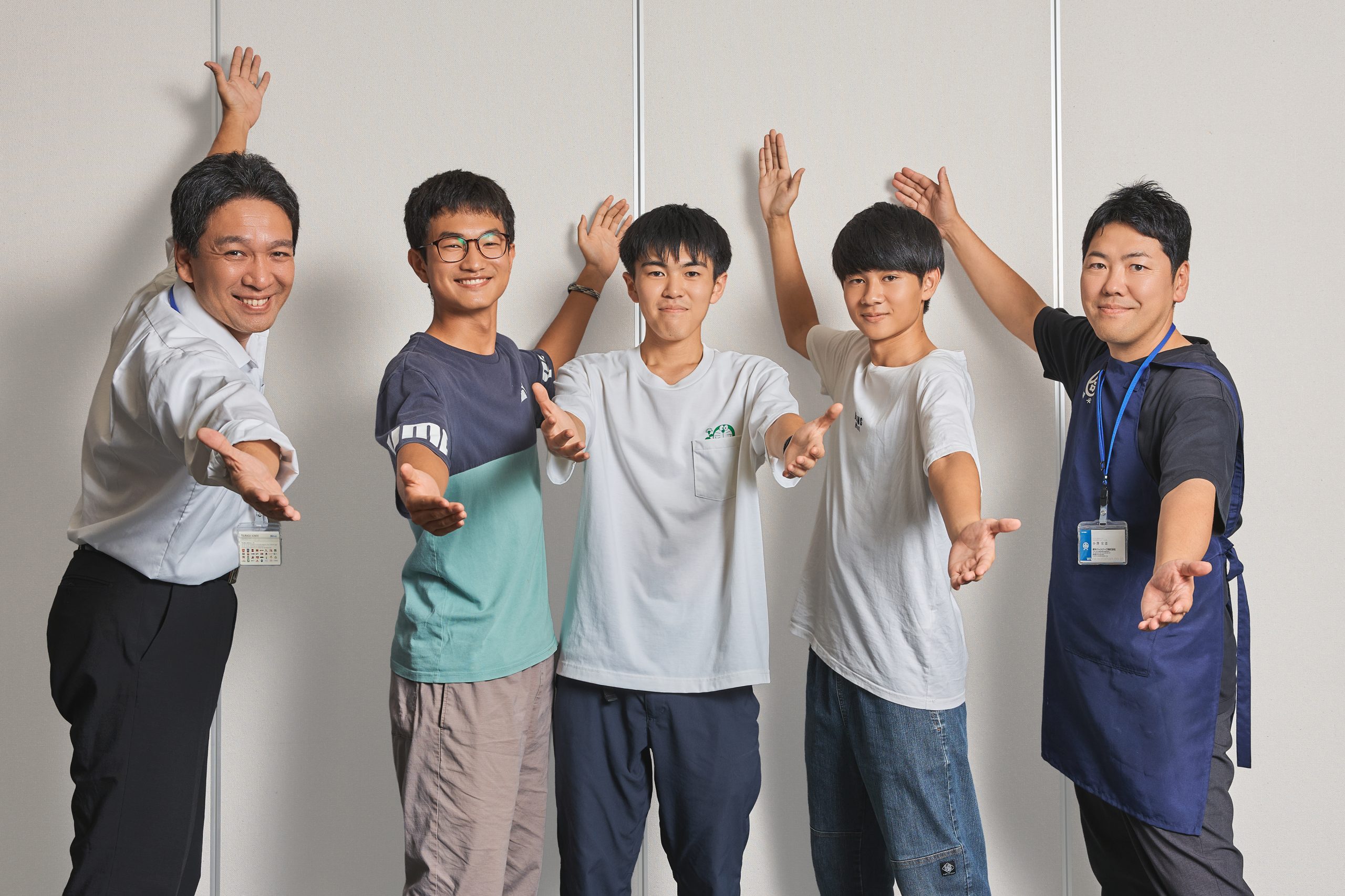 松本県ヶ丘高校(松本市)の「縣陵政経研究会」の高校生3人(写真中央)と、綿半のシェフ(写真左右)
