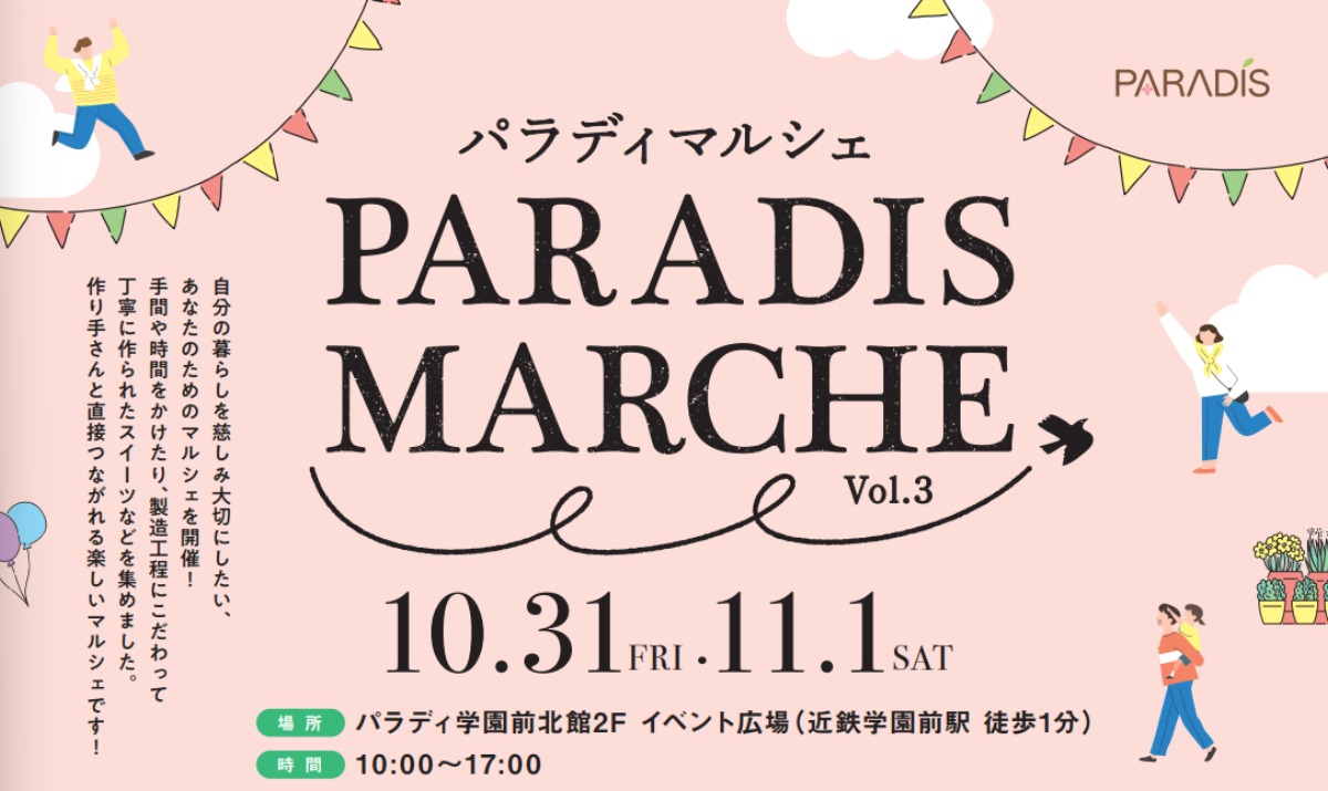 2025年10月31日(金)と11月1日(土)の2日間にわたり、学園前(奈良県奈良市)にあるパラディ学園前にて「PARADIS MARCHE(パラディマルシェ)」の第3弾が開催される!