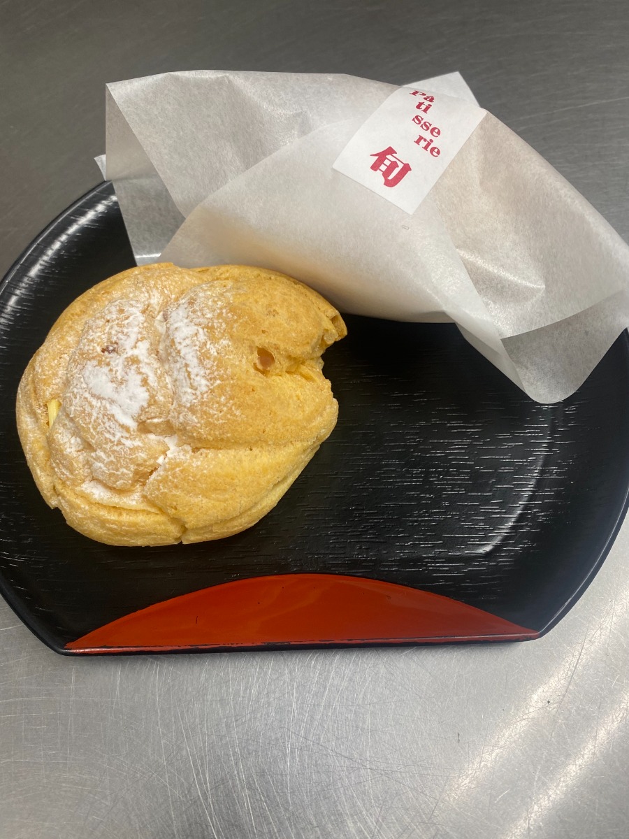 シュークリームは、シュー皮にアーモンドを練り込んで、クリーミーなカスタードが入っています。