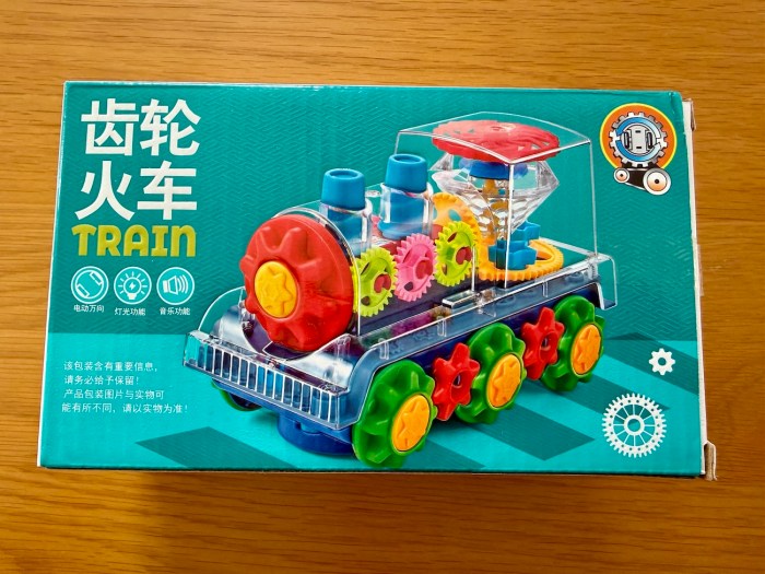 子供の教育に良いのか悪いのかなんて、大人が気にしすぎなのでは……などと考えていたら商品が到着した。難しい漢字が並んでいるが、たぶん「歯車トレイン」と書いてあります。