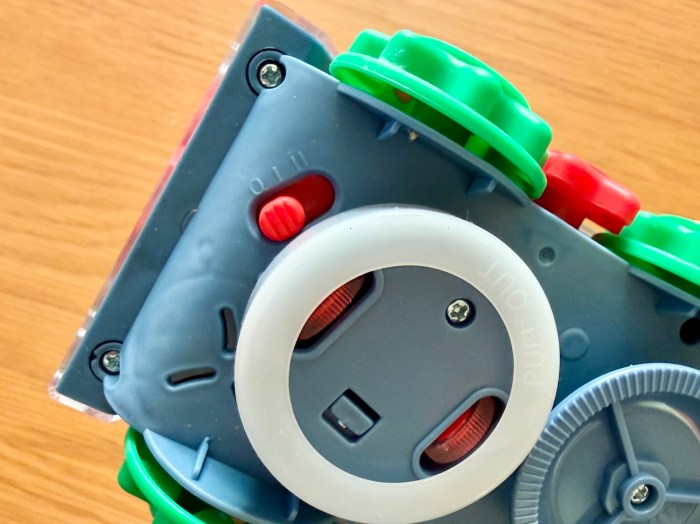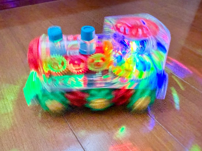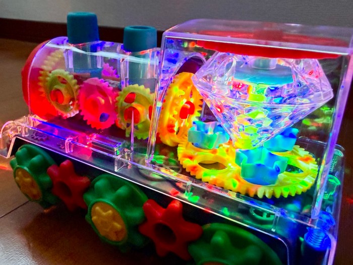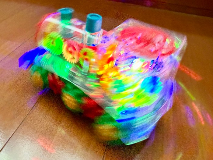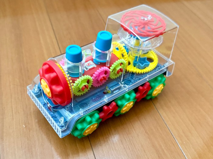 歯車トレインの見た目は完璧。透明なボディから歯車の動きがハッキリ見えるし、デザインもポップで可愛らしい。ライトアップしたら幻想的になるだろう。子供ウケも良さそうだ。