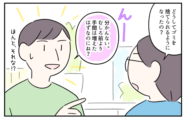 そんなコウ本人に「どうしてゴミを捨てられるようになったの?」と聞いてみても、「うーん、分かんない。むしろ前より手間は増えたはずなのにね?」と首をかしげるばかりで、理由は未だに分かりません。