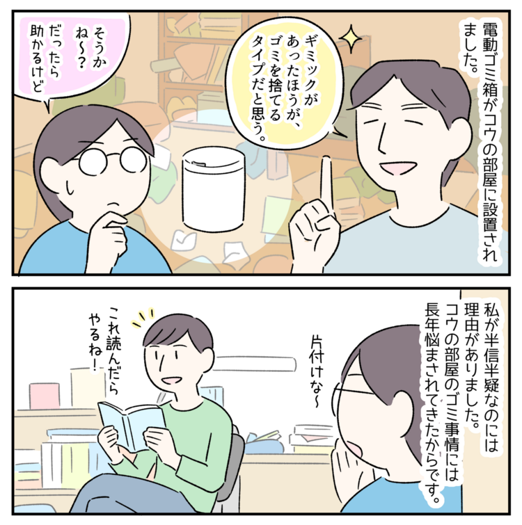 こうして、コウの部屋に電動ゴミ箱が置かれてから2か月ほど経った今も、コウの部屋の床にはゴミが落ちていません。積みあがった本や脱ぎ捨てられた上着があっても、ゴミがないだけで『不衛生な雰囲気』はかなり軽減されましたし、実際にコウも以前よりマメに掃除機をかけるようになりました。