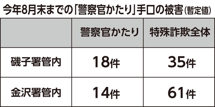 両署によると今年8月末までの特殊詐欺被害の認知件数は、磯子署管内で35件、金沢署管内で61件。被害額は磯子区が約4億円超、金沢区が3億円超に上る。そのうち「警察官かたり」の手口は磯子区が18件、金沢区が14件だった(数値は暫定値)。