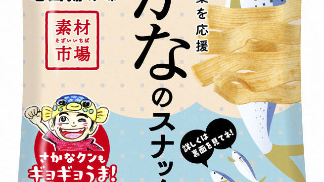 この“もったいない魚”をおやつとして手軽に味わってもらうため、同社の人気『素材市場』シリーズで活用し、「竜田揚げ味」のスナック菓子として開発。魚本来の旨味と香ばしい醤油の風味を合わせ、サクサクとした軽快な食感に仕上げました。