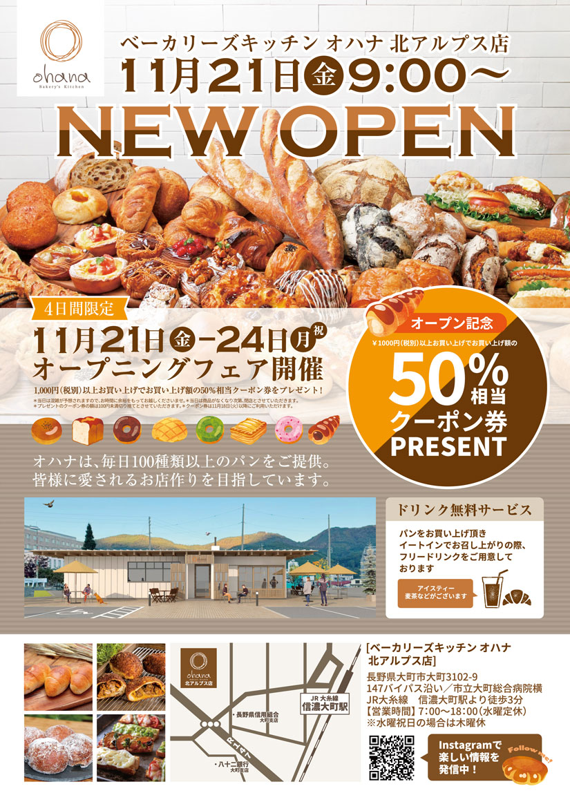 11/21(金)オープン「Bakerys Kitchen ohana 北アルプス店」朝7時から焼きたてパン100種以上を堪能!自家焙煎コーヒーも一緒に味わえるカフェスペースも用意@長野県大町市