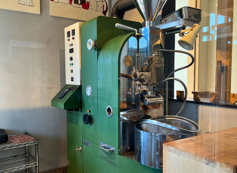 カフェスペースの一角に設置されている焙煎機。日々、コーヒー豆の焼き入れの実演もあるそうで撮影などは自由に行えます。職人の手仕事を間近で見ることができますよ。