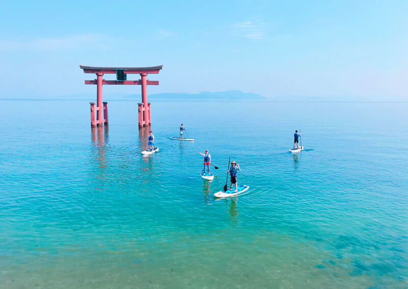 琵琶湖にある「白ひげビーチ・キャンプ場」は、近くにある白髭神社の湖上鳥居までSUPで行くことができます。日本一の琵琶湖に浮かぶように立つ鳥居を水面から見上げ、神社に向かって参拝すると、とてもご利益がありそうですね。インストラクターが同行するツアーもあるので初心者の方でも安心です。