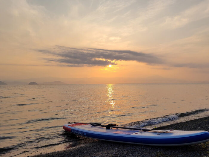 キャンププラスSUPのおススメの遊び方は、なんといっても「サンライズSUP」です。湖畔や海沿いのキャンプ場から夜明け前に漕ぎ出し、水面の上で日の出を迎えるのがサンライズSUPです。水辺のキャンプ場なら起きてすぐに漕ぎ出せます。