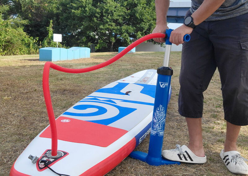 インフレータブルタイプのSUPは、空気で膨らませるだけ。専用のポンプで空気を入れます。準備運動がてら全身を使って入れましょう。SUP用のWポンプは、押しても引いても空気が入るタイプ。電動ポンプもありますが、キャンプ場で使う場合、とくに早朝は音に注意してください。