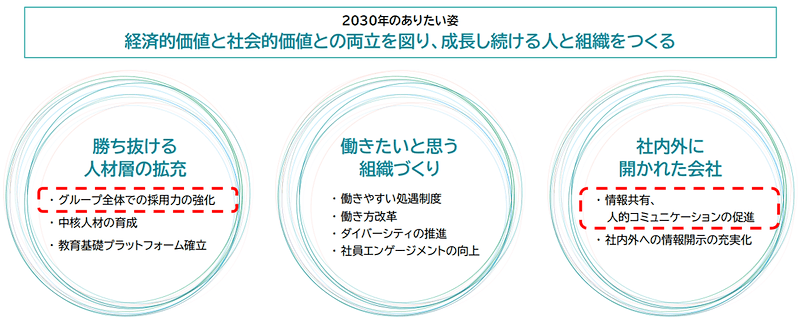 中期計画において同社は、2030年のありたい姿として「経済的価値と社会的価値との両立をはかり、成長し続ける人と組織をつくる」ことを掲げ、「勝ち抜ける人材層の拡充」「社内外に開かれた会社」「働きたいと思う組織づくり」という3つの方針を示している。今回の取り組みは、その実現に向けた採用力の強化や人的コミュニケーションの促進を進めるための施策としている。