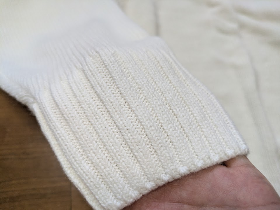 コットン素材なのでウールのようなぬくもりはありませんが、逆に言えば真冬以外の長いシーズンで活躍してくれそうです。厚手でしっかりした編み目なので、春先や秋口の肌寒い時期から初冬まで重宝します◎