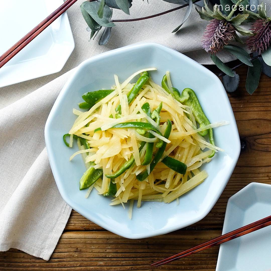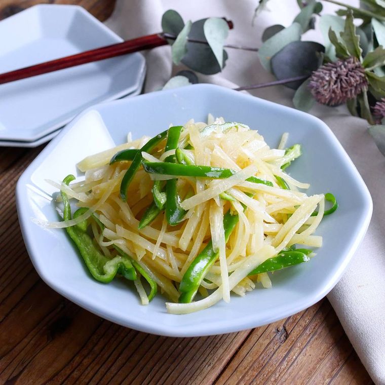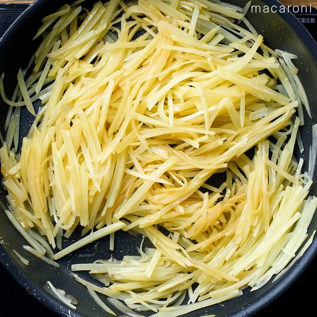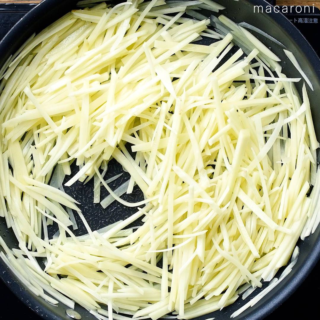 3: フライパンにサラダ油を引いて熱し、じゃがいもを加えて全体に油が回ったら、酢を加えて中火で3分ほど炒めます。