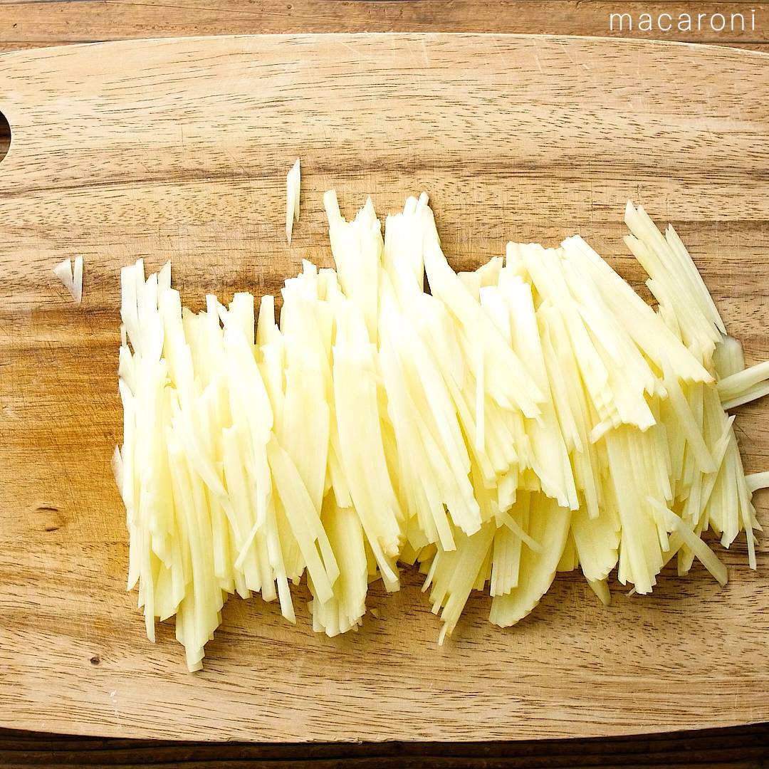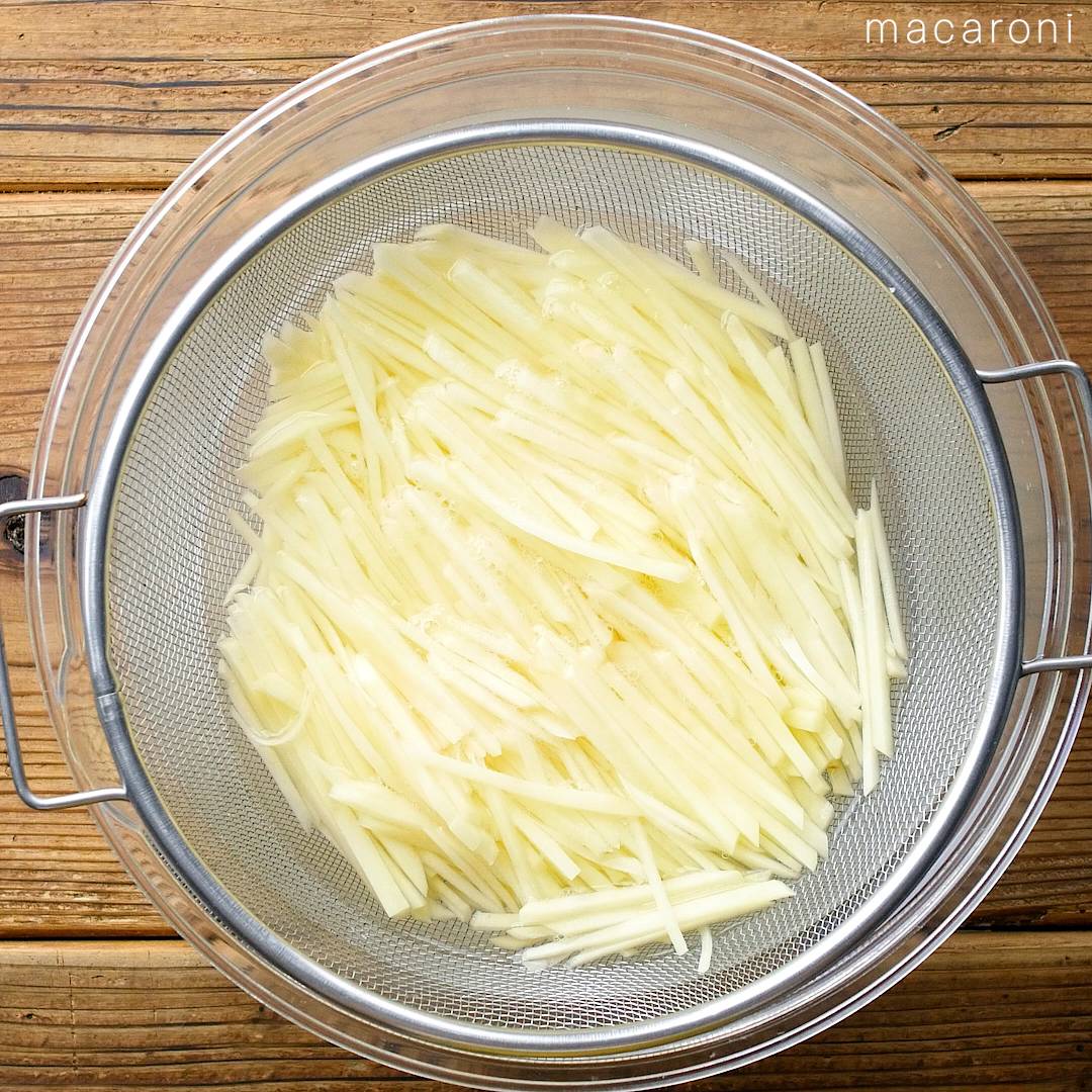 2: ボウルに、水・①のじゃがいもを入れて水にさらし、ザルにあげて水気をきります。