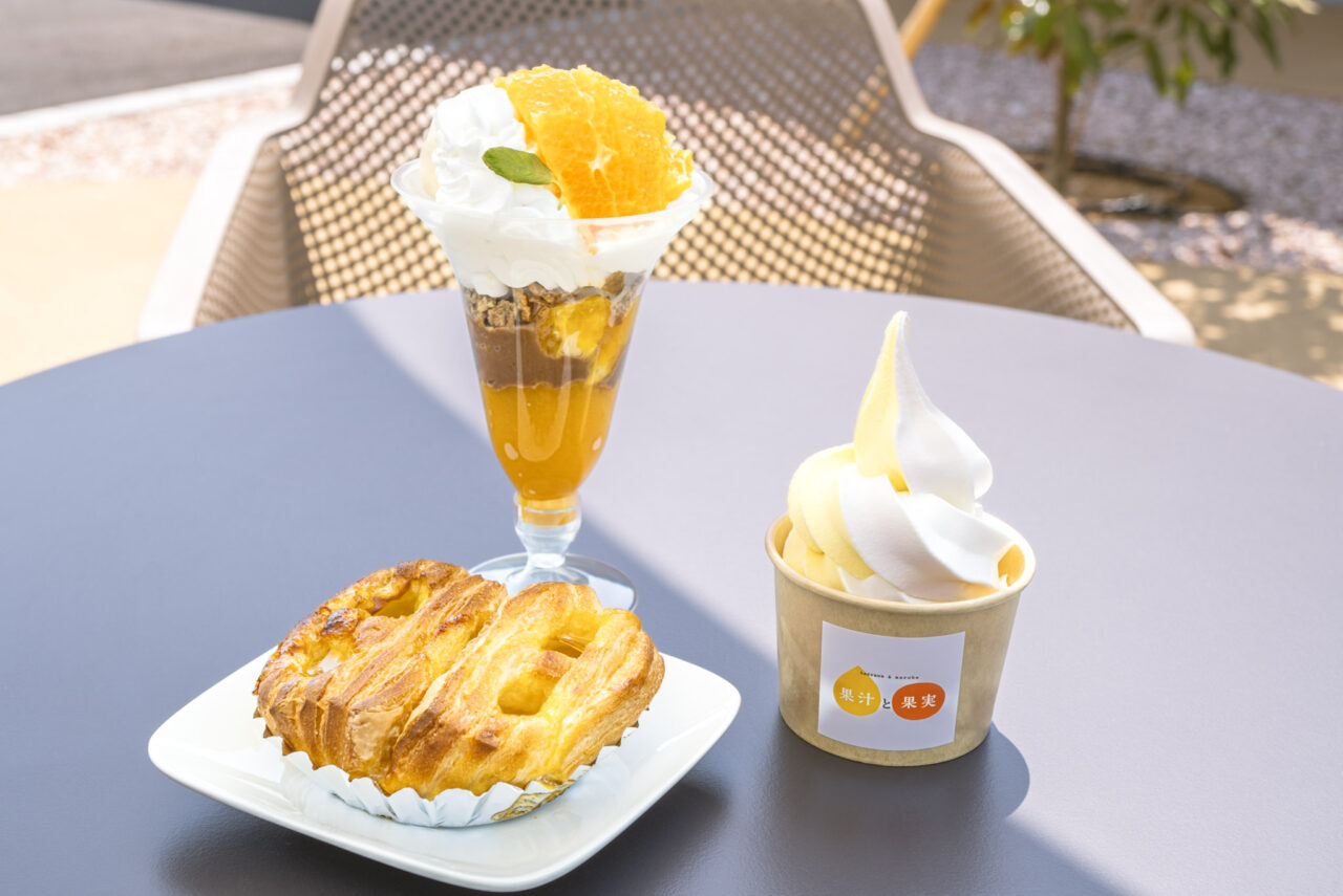 2025年3月にオープンしたカフェ「果汁と果実」では、「季節のパフェ」など、みかんをはじめとする柑橘類や同園の商品をふんだんに使ったメニューがラインアップ。テイクアウト専門ですが、カフェで購入した商品はテラス席でゆっくり味わうことができます。