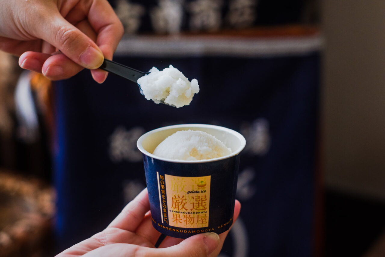 「果物のおいしさをそのまま楽しんでもらえるように」をコンセプトに作られたジェラートは、果物本来の風味がしっかり感じられます。今回いただいた新甘泉という梨のジェラートは、爽やかで瑞々しい新甘泉の旨味をダイレクトに味わえる贅沢な逸品。