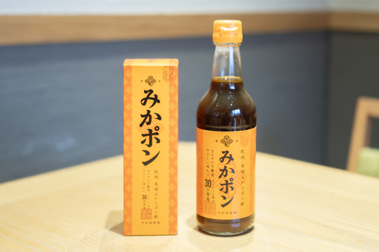 「みかポン」はみかんやゆず等の柑橘類の果汁を30%含有したポン酢で、まろやかな酸味が様々な料理とマッチ。リピーターが多い逸品です。