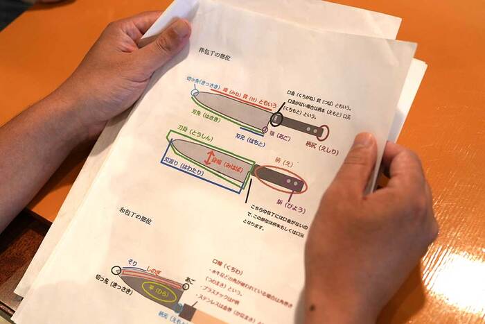 プロの料理人さんから、包丁の部位や研ぎ方の説明を受けます。