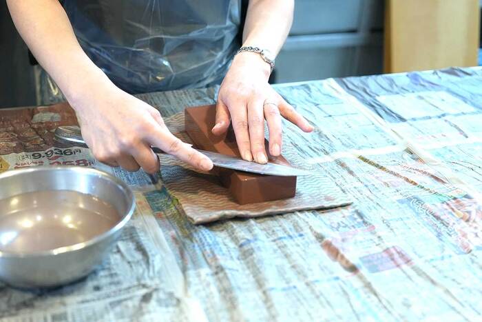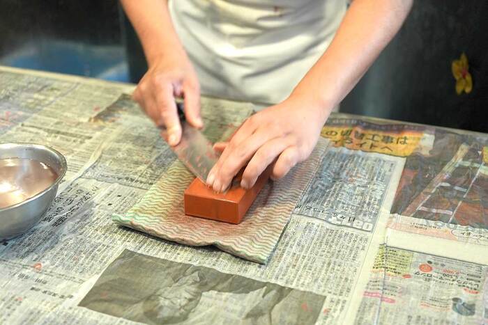 砥石にも種類があるそうで、包丁研ぎには中砥(なかと)という煉瓦色の砥石を使うそうです。