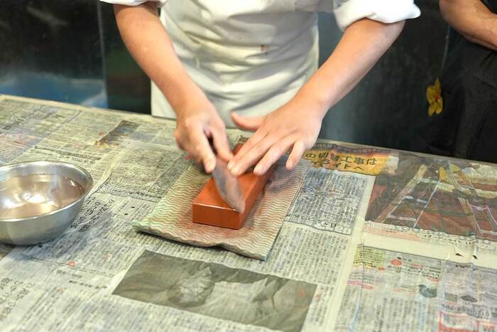料理人さんが説明しながら実際に包丁を研いでくれます。
