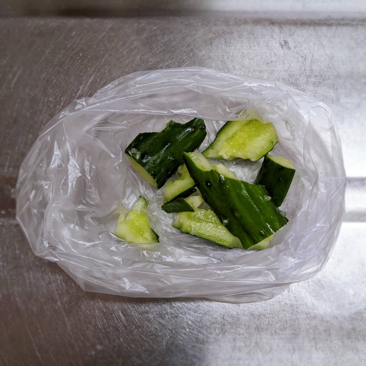 きゅうりはポリ袋に入れ、軽くたたいてほぐしましょう。
