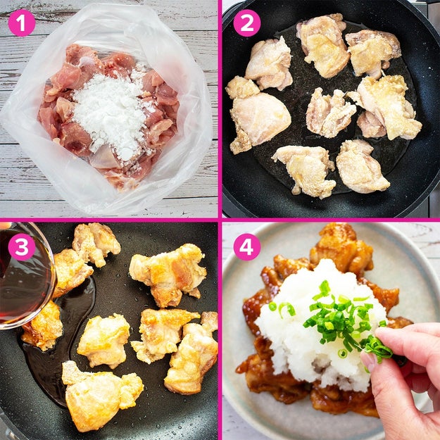 ① 鶏もも肉は一口大に切り、片栗粉をまぶす。