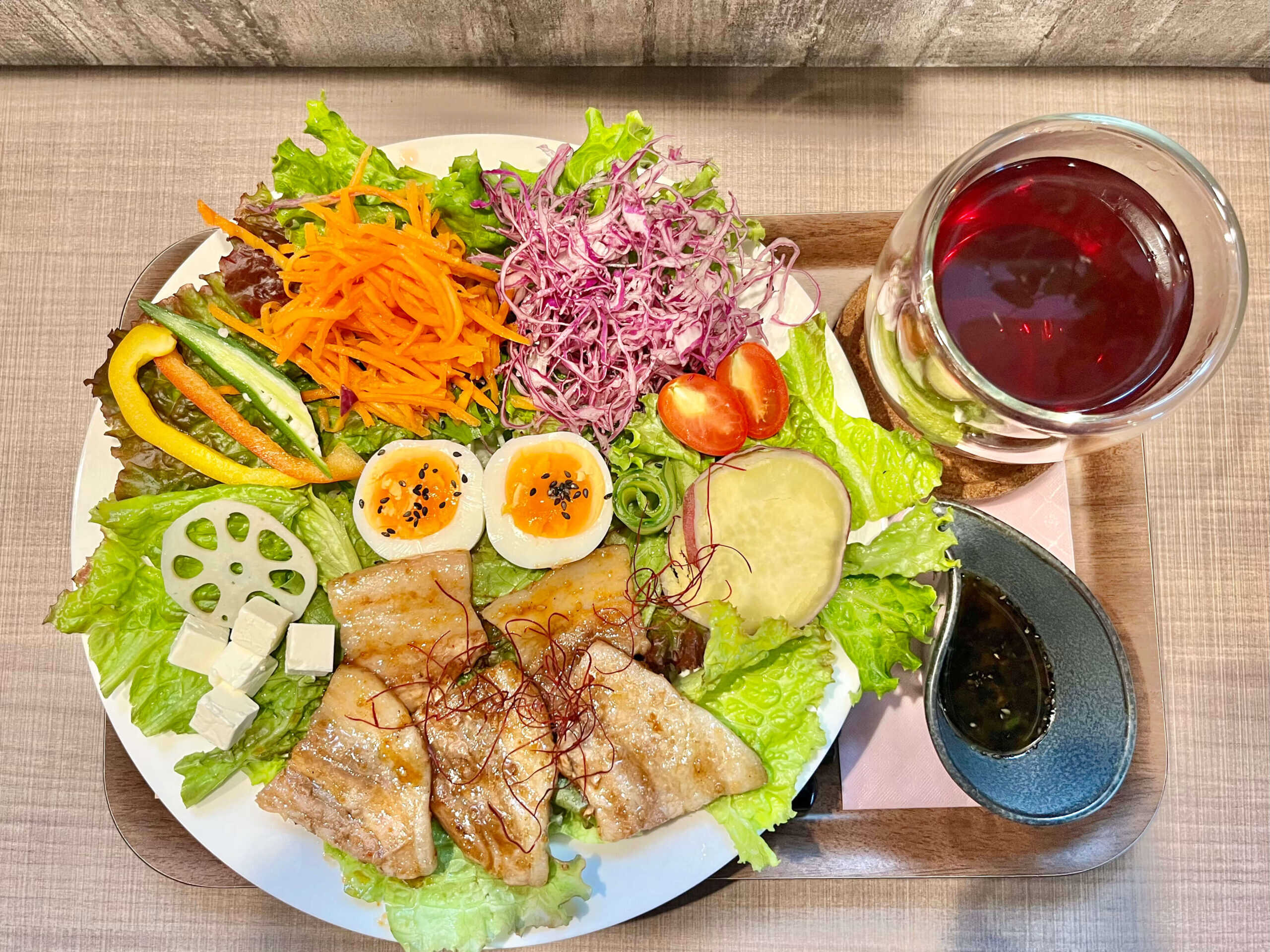 国産の食材にこだわったサラダボウルは、見た目の彩りだけでなく、味や栄養のバランスも抜群。グルテンフリーのケーキや自家製ドリンクなど、食後まで罪悪感なく楽しめるのも嬉しいポイントです。