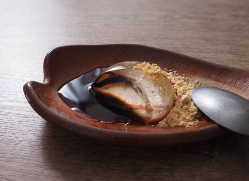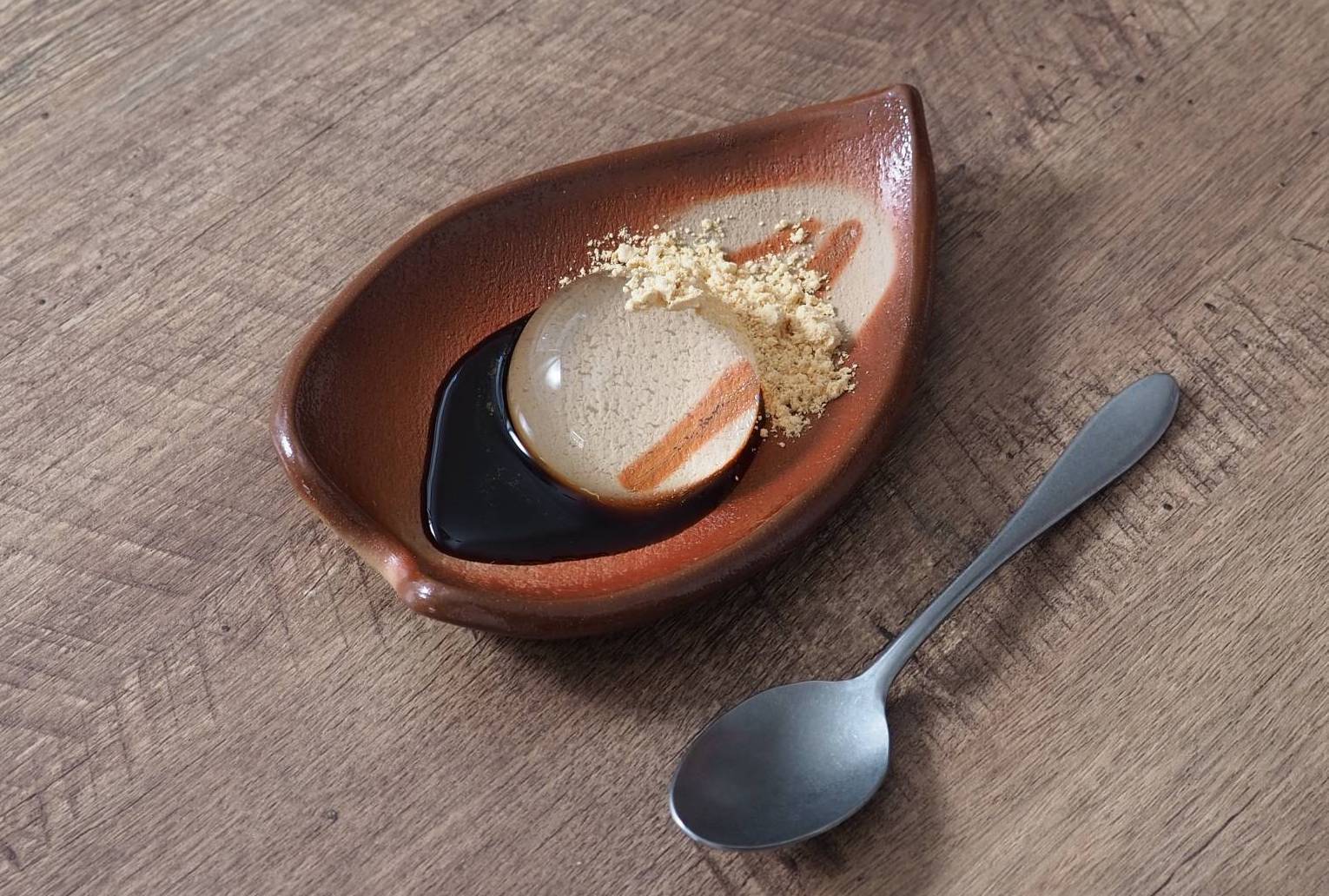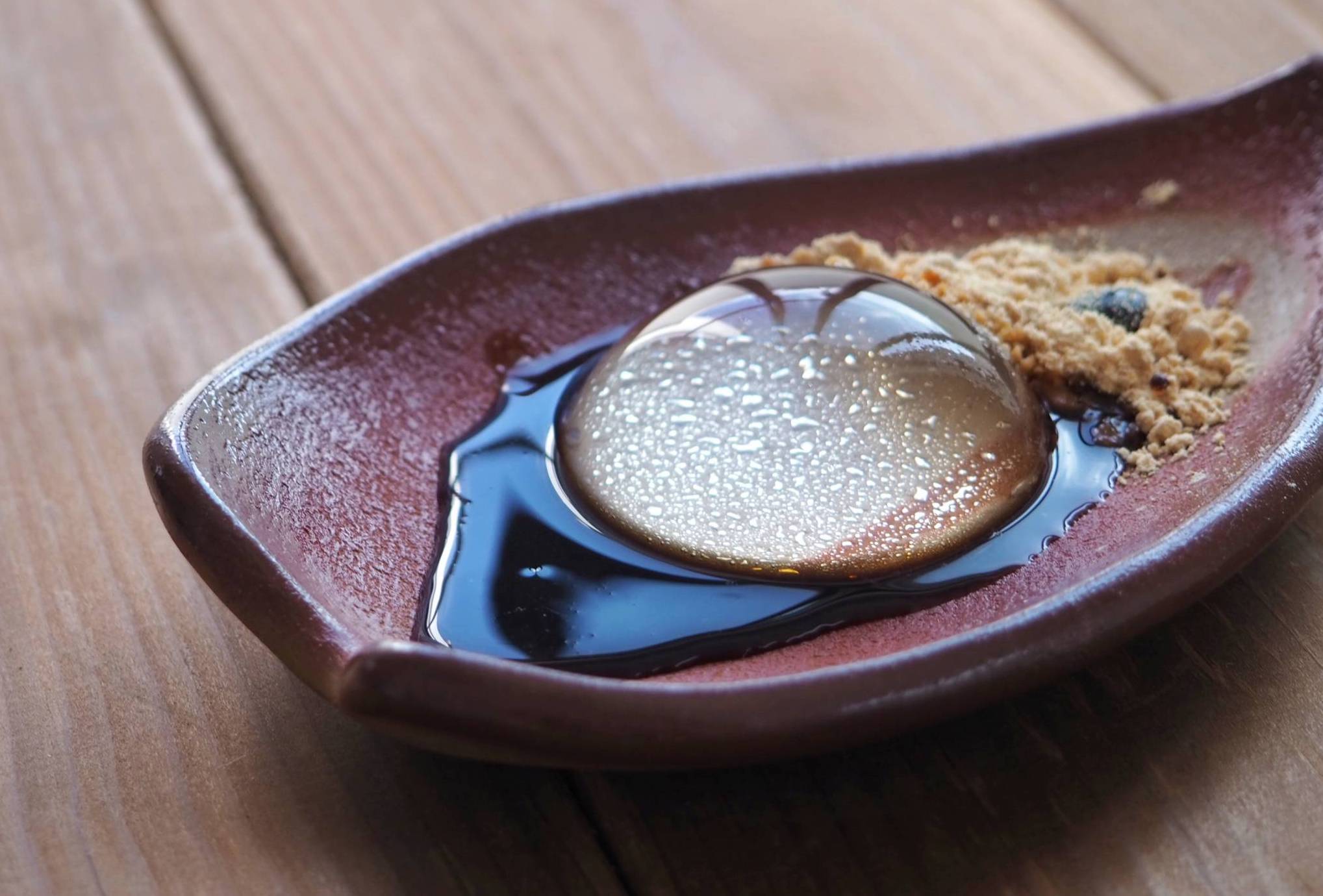 冷やし固まり型から外した水わらび餅に、先ほどの黒みつときな粉をかけて完成です。