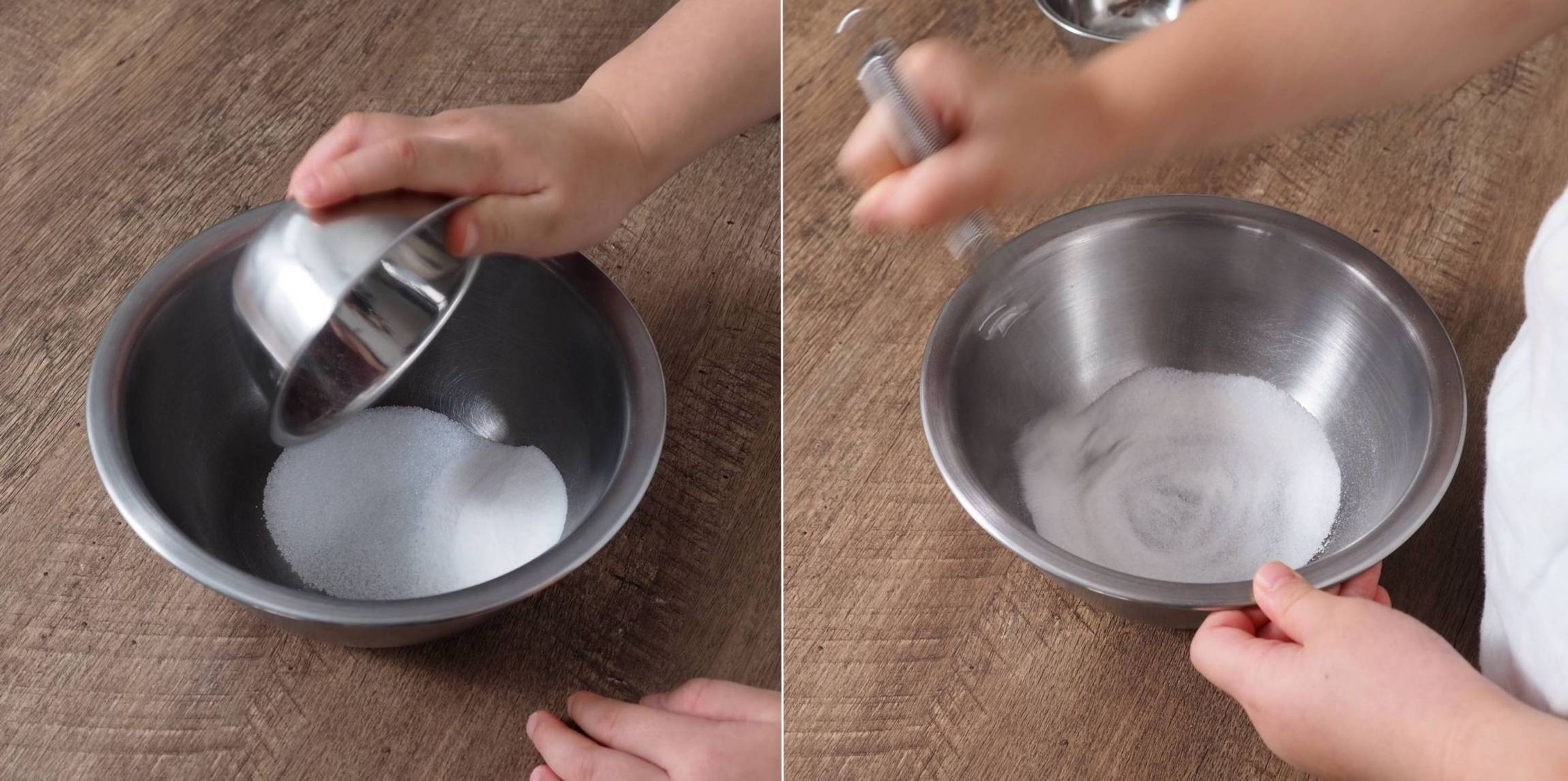ボウルにイナアガーとグラニュー糖を入れ、泡立て器でよく混ぜ合わせます。