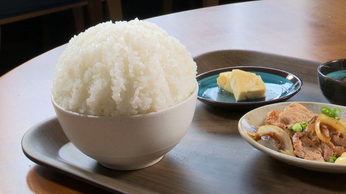 上越産のコメをふっくら炊き上げたご飯は注文時に大・中・小、そしてボリューム満点の昔話盛りの中から量を選べます。おかわりも無料です。