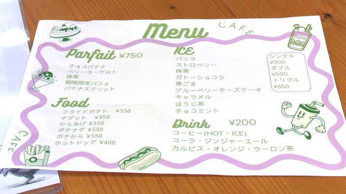午後2時からのカフェ営業ではドリンクやアイス、手作りのパフェや軽食を提供しています。