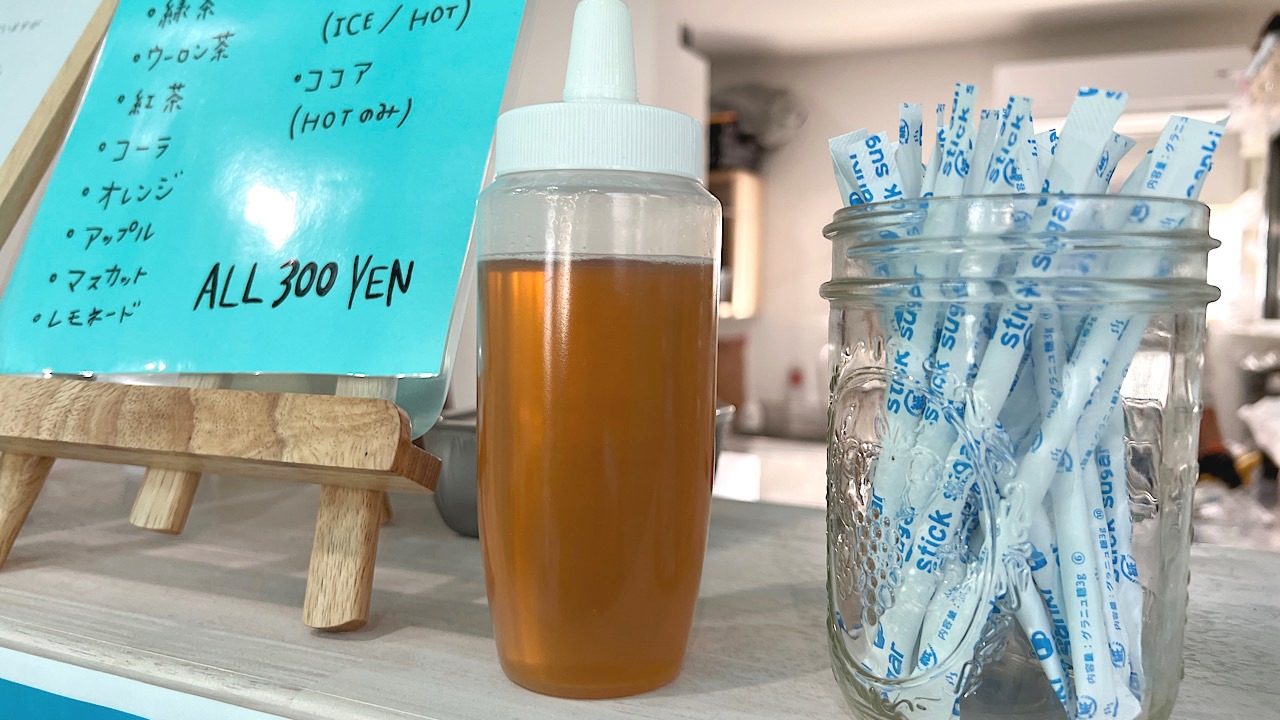 カウンターの上に大きなボトルがあるので、自分の好みの甘さになるまで存分にどうぞ。