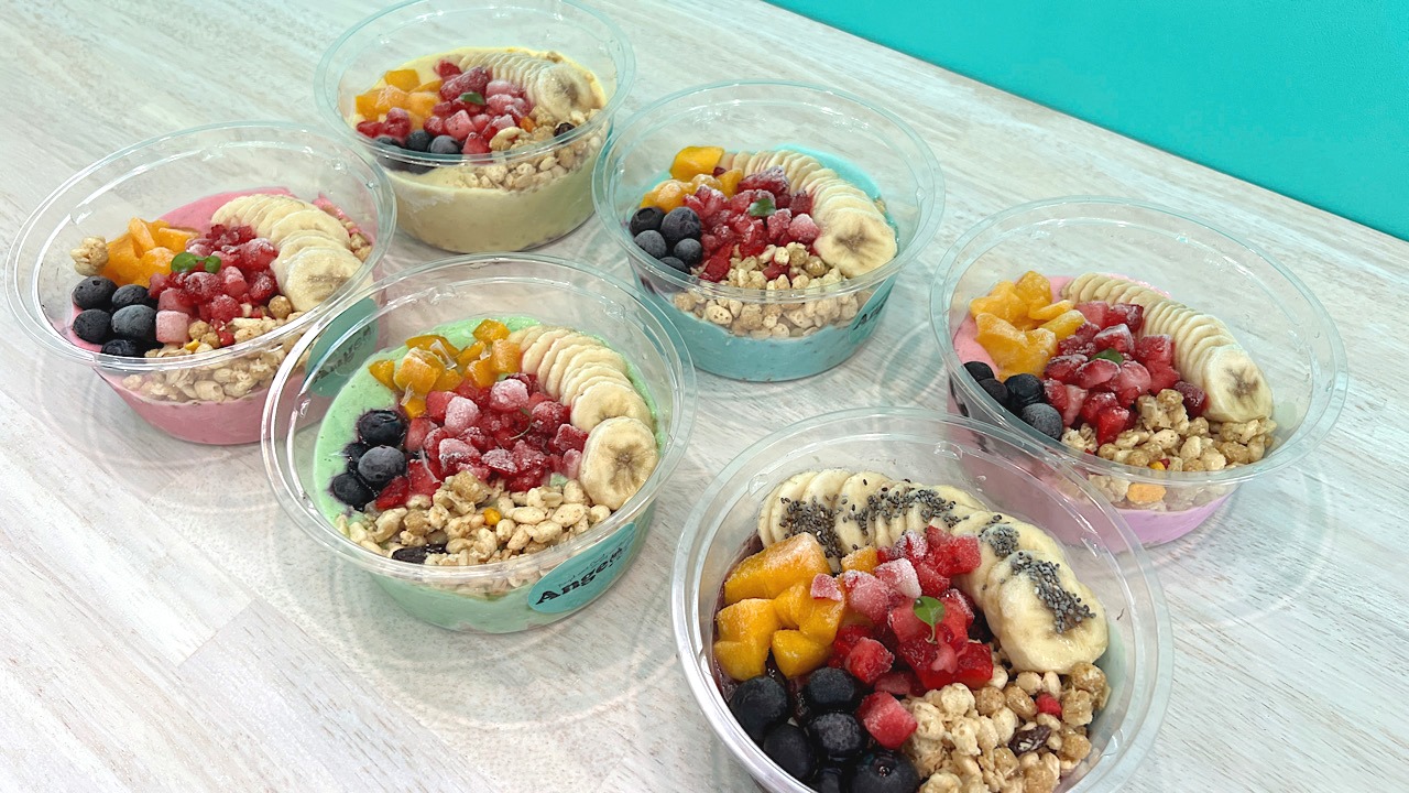 バナナやグリークヨーグルトをベースに、ピンクはビーツ、黄色はマンゴー、緑は抹茶、赤はピタヤ(ドラゴンフルーツ)、青はスピルリナをブレンドして鮮やかな色を出しているそう。
