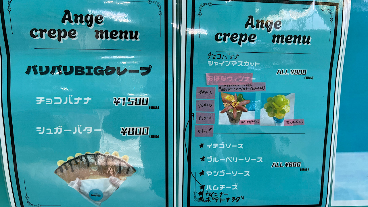 クレープはしっかり焼いた「バリバリ」食感の大きなものと、スタンダードな巻きクレープがあります。スイーツ系のほか、食事系もラインナップ。