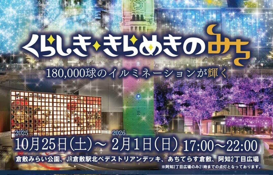 2025年10月25日(土)~2026年2月1日(日)の期間、岡山県倉敷市のJR倉敷駅周辺の倉敷みらい公園、JR倉敷駅北ペデストリアンデッキ、あちてらす倉敷、阿知2丁目広場にて、イルミネーション「くらしき きらめきのみち」2025が開催されます。