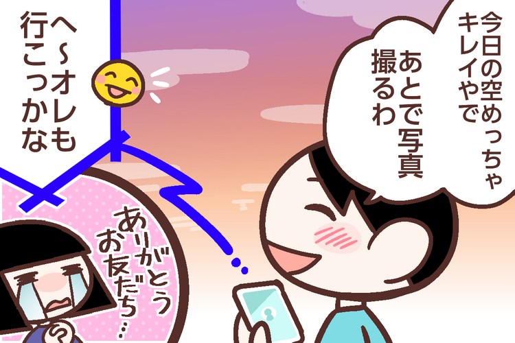 そして何より、息子のスマホの外出を助けてくれたのはネットで知り合った友だちでした。外へ出る時は通話をしながらだったり、息子が散歩に行くというと「じゃあ俺も行く!」と遠く離れた土地で同時に散歩をしたりと、息子の障害のことは本人が話したり相談したりしているから知っていると思うのですが、けして押し付けがましくもなく、同情するでもないそのさりげないサポートに、息子だけでなく親の私も救われました。
