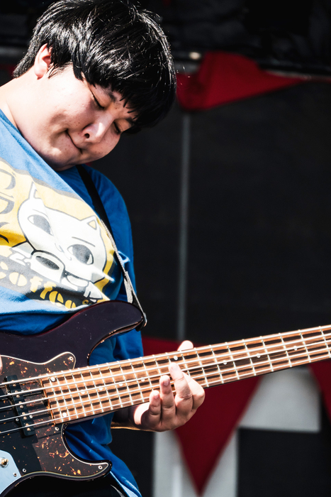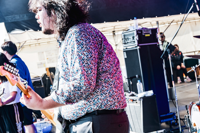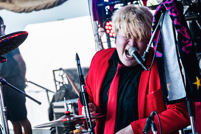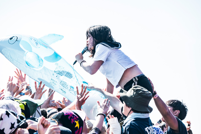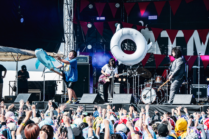 この時間にナイスチョイスとしか言いようがない「熱中症」では盛り上がりを見せたところでイルカのビーチフロートとサメのイラストが入った浮き輪が投げ込まれ、観客が沸く。4人の見た目のインパクト(衣装はもちろん、平均体重100kg/男性陣は身長180cm超)&ときどき我を忘れたように歌いギターをかき鳴らすセンターのオニザワの姿に一瞬脳がザワつくが、巧みなバンドサウンドがハッとさせるように耳を捉える。