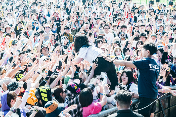 曲が彼女たちの代表曲「可愛いユナちゃん」へ突入すると観客からは手拍子が起こり、それに促されるようにオニザワが客席へダイブ! ラストソング「バカマ●コあかり」へ曲が移っても、観客の海を泳ぎながら盛大に腹チラして歌詞を叫び続けたオニザワ。超ド級の爪跡を残したなぁ! という感想を持ったが、そういえばライブ中のMCはドラムの豆知識や今朝5時に大阪に着いて行った健康ランドでの話と気負いはゼロ。ぜひ次は大きいステージで見たい!