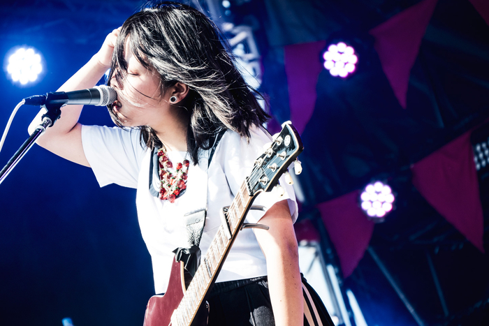 超☆社会的サンダル、リベンジ成功だ。昨年の出演が台風で見送りとなり、念願だった彼女たちのステージはついに「17」で幕を開けた。大人になりきれない葛藤をセーラー服に身を包んだオニザワマシロ(Gt.Vo)が紡いでいく。続いた「チチンプイプイプイ」でも、キュートなオニザワの声をどっしりと支えるグレースーツのタケマスター(Gt)、青Tシャツのふじお(Ba)、恐ろしく赤いセットアップの林田翔馬(Dr)のふっといサウンド。