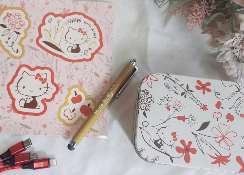 付録には、キティちゃんが描かれた缶ケースやステッカー台紙、USB充電ケーブル、携帯のメモアプリに使用できるタッチペンが含まれています。