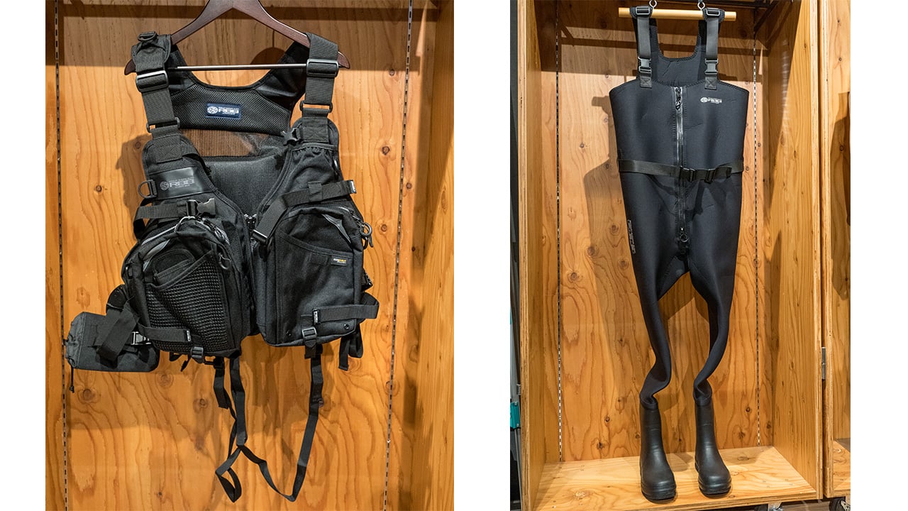 左はRBBエクストリームタイドゲームベスト(リバレイ)。右はRBBフロントオープンウェーダーCR(リバレイ)