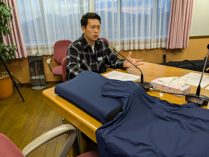 このシリーズは、約7年ほど前から、整体院の先生(東京に診療所がある先生)とコラボして手掛けている商品です。先生に静岡まで来てもらい、勉強しながら、寝ている時の姿勢や睡眠に対して「何がいいか」を説明してもらい、それを元に形、硬さ、高さなどを決めて開発しているとのことです。